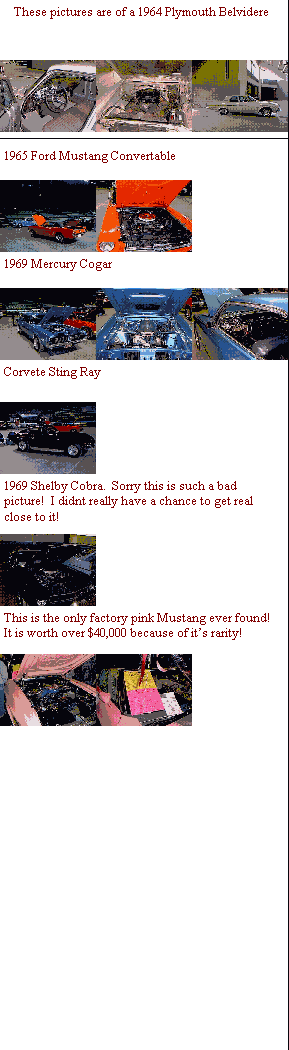 Here are some pictures of some really awsome cars. I got these pictures from a auto show I went to in Birmingham on February 21! I hope you enjoy looking at them as much as I do! Just click on any of the cars and whala, A larger one that is saveable will appear like magic! Just right click, and save to file!!! Oh yea, if you have any pictures of cool cars, I would greatly enjoy you emailing them to me! I will be sure to put your name and if you have one, a link to your web page and email address!!!
